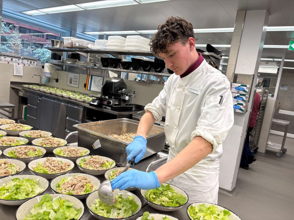 Dario: In der Küche läuft es gut, ich kann immer fragen, wenn ich etwas nicht weiss oder unsicher bin, und nie ist jemand genervt, wenn er oder sie mir etwas zeigen oder erklären muss. Es ist nie schlechte Stimmung in der Küche, das ist schön. Was mir besonders gefällt, ist, dass ich am Ende direkt das Ergebnis meiner Arbeit sehe und dass die Leute so oft rückmelden, dass das Essen lecker ist. Was noch etwas schwierig ist, ist draussen beim Schöpfen, wenn viele Leute gleichzeitig da sind und alle verschiedene Wünsche haben, zum Beispiel bei der Portionengrösse. Und der Service am Band ist manchmal etwas langweilig, wenn man nur einzelne Komponenten schöpfen muss. Und ja, auch wir putzen oft in der Küche!
